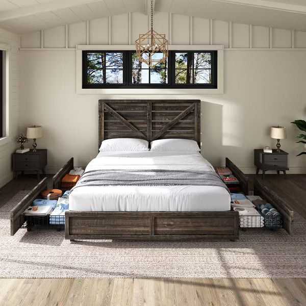 48.8" H Bed Frame with 4 Storage Drawers, Barn Door Headboard, Rustic Wood Grain, No Box Spring Needed