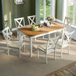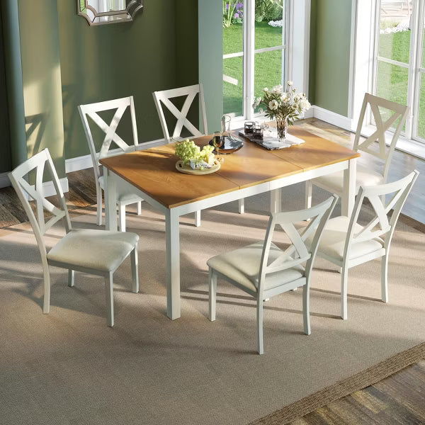 AMERLIFE 60" Space Saving 7-Piece Farmhouse Solid Wood Dining Table Set with 6 Upholstered Chairs, Brown & White