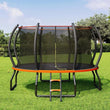 Bring safe, bouncy fun to your backyard with this outdoor trampoline designed to meet ASTM F381-16 standards. Featuring eight outward-curved, foam-padded poles and a 360° PE safety net, it ensures secure play for kids of all ages. Installation is quick with a snap-on joint system—no complex tools required. The sturdy steel frame with anti-rust coating supports powerful carbon steel springs and a high-density PP mat, delivering strong bounce and comfort. An included ladder adds easy access for little ones, while the L-shaped zipper with safety buckle keeps everything secure. Whether for play or exercise, this trampoline offers lasting durability, safety, and joy.