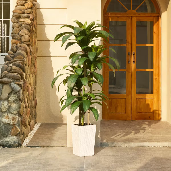 Make every entrance unforgettable with our 6-foot dracaena tree that brings tropical sophistication to living rooms, offices, or foyers. Standing taller than most artificial plants on market, this floor plant becomes an instant focal point - its silk leaves catching light like nature's own stained glass in lush greens and sun-kissed yellows. The secret? 4 master-crafted branches wrapped in UV-resistant foliage that feels startlingly real to the touch. Unlike cheap fake plants, each stem mimics authentic bark texture. Our weighted 15.7" planter (choose from Black/White/Coffee) stays firmly planted - no more "leaning tower of Pisa" effect common in faux trees. Perfect for busy homeowners who crave low-maintenance house plants without sacrificing drama. Place this tall plant beside your sofa to soften angular spaces, or flank a dull office corridor with twin artificial trees. Unlike real dracaenas that yellow in sunlight, our faux plant thrives in sunrooms and bright lobbies - wipe dust monthly with a microfiber cloth and watch it outlive your furniture. Dracaena tree fake plants never looked this alive!