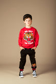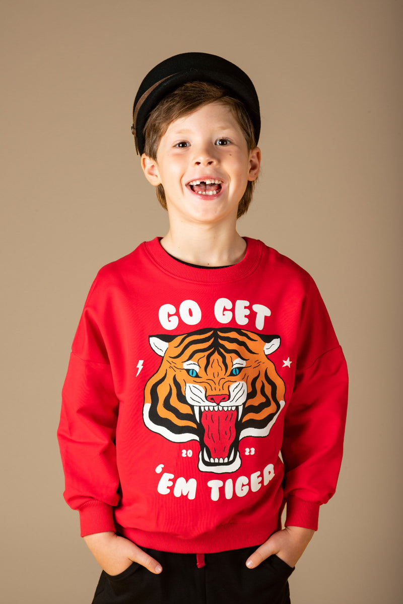 This Go Get Em Tiger Sweatshirt will be a favourite piece for the season. It features a roaring tiger print on a red base with ribbed neck, hem and sleeve cuffs. It is made from 330GSM 95% cotton 5% elastane French terry and has a loose fit with drop shoulders.