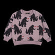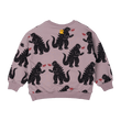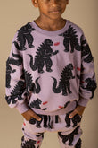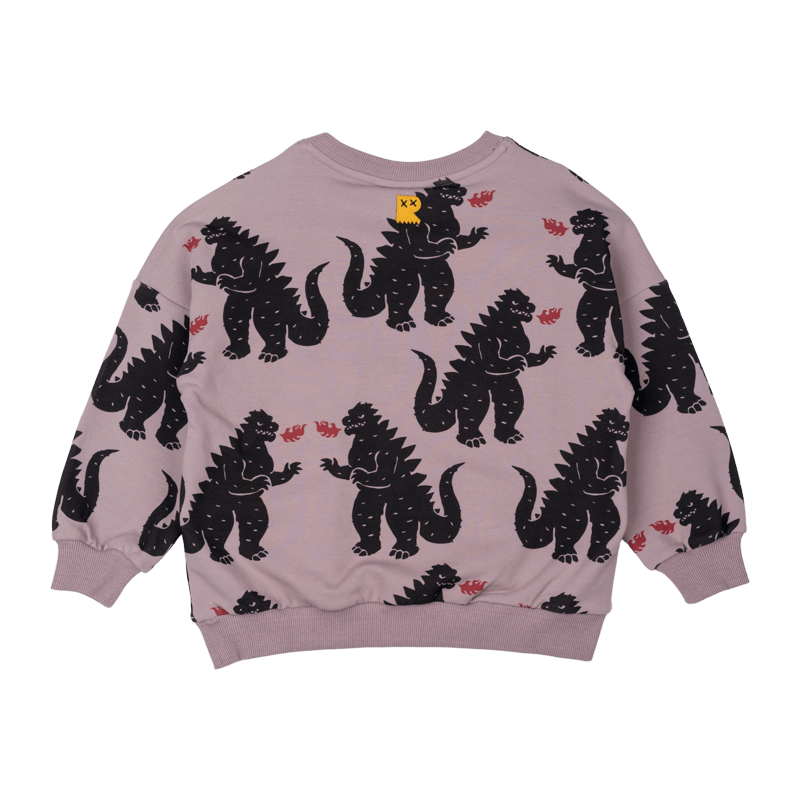 The Godzilla Fire Sweatshirt is a great transeasonal top. It featurres an all over print of fire breathing Godzillas on a soft grape base with ribbed neck, hem and sleeve cuffs. It is made from 330GSM 95% cotton 5% elastane French terry and has a loose fit with drop shoulder sleeves.