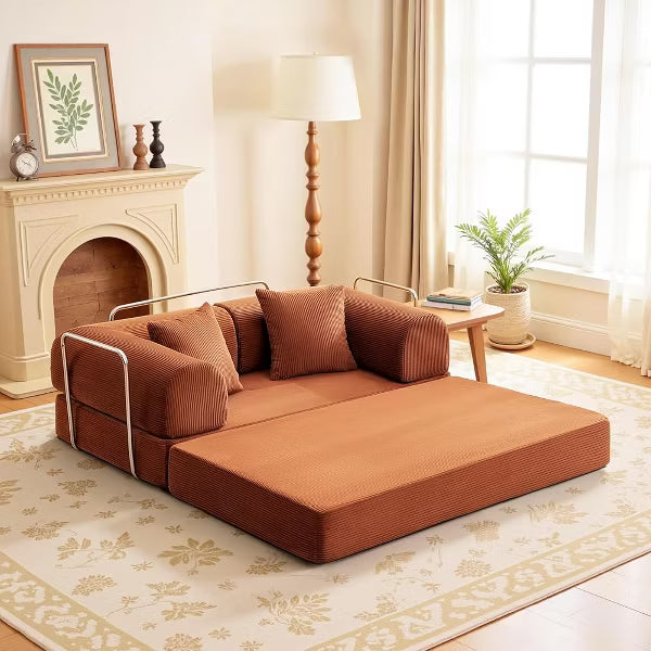 4-in-1 Multifunctional DesignDesigned for versatility, this convertible folding sofa bed effortlessly transforms into a cozy sofa and a comfortable bed. Includes two free pillows for added comfort. Whether you need a comfortable couch for your living room, a plush guest bed in a spare room, or extra seating in a home office, this convertible sofa effortlessly fits the bill. High-Density Memory Foam for Superior ComfortCrafted with premium high-density memory foam, this couch bed provides excellent support while contouring to your body's natural shape. The memory foam couch helps relieve pressure points, promotes relaxation, and ensures long-lasting durability without sagging, offering you the perfect balance of comfort and support. Breathable & Removable Cover for Easy MaintenanceThe soft, breathable corduroy fabric cover enhances airflow to keep you cool and comfortable. Featuring a durable zipper design, the cover is fully removable and machine washable, making cleaning and maintenance effortless while ensuring a fresh and hygienic experience every time. Compact & Space-Saving Foldable DesignIdeal for small apartments, dorm rooms, offices, or travel, this folding sofa bed is lightweight and easy to store. When not in use, simply fold it into a compact shape to maximize space. Its portability allows you to move and reposition it effortlessly for different occasions. No Installation RequiredUnpack, pat, place the folding mattress couch for 48 to 72 hours to allow it to fully expand to its original thickness. There's no need for complicated tools, obscure instructions, or extra time wasted on setting it up. Simply unpack your new loveseat sofa, adjust the armrests to your desired configuration, and you are ready to relax.