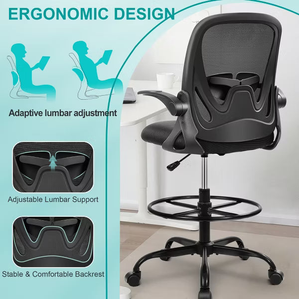 Adjustable Drafting Chair:This high rotary drawing chair has a foot stool with adjustable height, and the 90 degree overturned armrest design can save a certain amount of space, which is very suitable for standing desks, sitting desks and bars; Equipped with a round foot ring can help you move your feet more frequently, reduce the pressure on the back of your legs and improve comfort. Ergonomic office chair:This ergonomic chair has a curved backrest, which perfectly fits your body curve. There is an adjustable lumbar support in your back, which is designed to protect your spine and relieve back and spinal pain during long-term work. The design of cushion edge can relieve pressure and promote blood flow in your legs. Soft and Breathable:The breathable mesh back of the seat and the 3 inch thick streamlined seat cushion are soft and elastic enough to reduce the discomfort caused by sitting for a long time. The seats are filled with high-density and thick sponges, and the breathable mesh structure greatly improves the permeability, thus avoiding the feeling of sultry, especially in hot seasons. Reliable Mobility:360¡ãrotating chairs can facilitate communication. Smooth rolling casters allow you to move anywhere you want. Its five claw base can evenly disperse the pressure applied on it, always maintain stability, and reduce the sound when sliding. After-sales Service:Our drafting chair frame made of FSC-Certified wood. We will provide you with the best service. The period of coverage is one year for repairs and replacements. If you have any questions, Please Get In Touch.