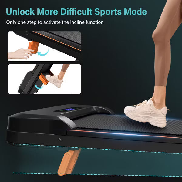 2 in 1 Walking Pad TreadmillOur under desk treadmill is suitable for walking and jogging. You can adjust the speed between 0.6-3.8 MPH as needed, you can customize your workout speed to meet your needs, making it easy to keep up with your fitness habits! Comfortable Shock-absorbing TreadmillThe treadmill with 5 layers of anti-slip belts, 8 silicone shock absorbers and 2 soft rubber pads is equipped with a comfortable running belt and cushioning system to reduce the impact on joints and improve running comfort. Real-Time Accurate Data TrackingThe walking treadmill features a clear LED display that cycles through time, speed, distance and calories during use. So you can keep track of your exercise data at a glance. Compact Treadmill for Easy MovementThe walking pad treadmill is lightweight and has two front wheels for easy movement. Installation-free design, ready to use right out of the box. The design is compact and easy to carry, you can place it under the bed or sofa to save space at home. 2.5HP Power & Stable MotorAXEFIT walking pad, with a 2.5HP motor with a maximum load capacity of 265 pounds which keeps the sound level below 45db during treadmill operation. Lets you use it anytime at the office and home without worrying about disturbing others. Enjoy a quiet and comfortable exercise experience with the treadmill.
