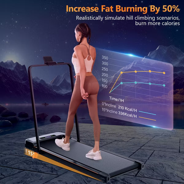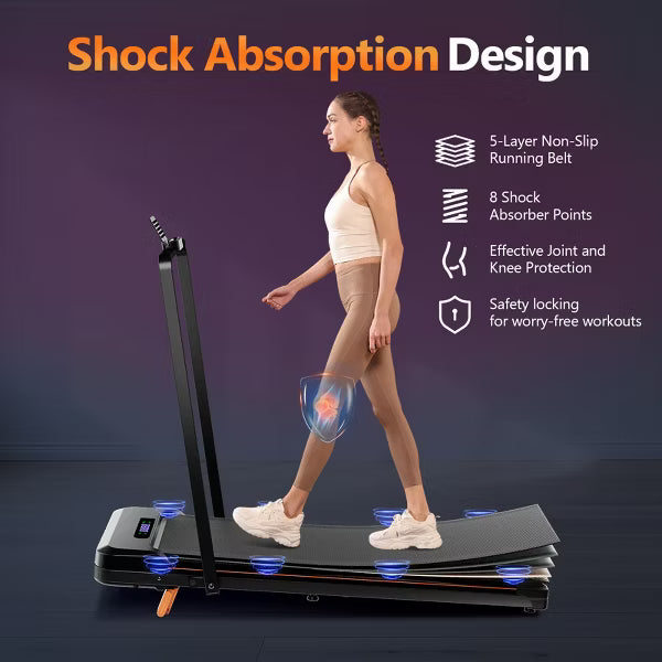 Space Saving & PortableWith a thickness of 4.5", our portable treadmill can be easily stored under a sofa and bed. The design of the built-in wheel allows users to move the walking pad around with ease. Moving a treadmill is no longer a problem. For Healthy Life Style This compact treadmill has a size of 47.6"x19.6" which means it can be placed not only in a big house but also in an apartment. When you can't go out for exercise, you can still do it at home. Keep fit, keep healthy. Quiet and Powerful Motor The under desk walking pad is equipped with a 2.5HP motor which provides powerful power to the treadmill, allowing it to carry a load capacity of 265lb. At the same time, the motor is quiet and will not disturb others. 5 Layers Durable Anti-slip Belt Our walking pad has adopted with 5-layer belt to improve the safety of users. Durable, anti-slip, easy to clean, and with less knee shock, this running belt brings a comfortable exercise experience. It also increases the service life of the treadmill. 2 Shock Absorb CushionsFor healthier exercise, we designed two cushioning pads for the treadmill to reduce the impact on the user's knees and ankles during exercise. Large LED Display and Smart Remote The large display of the under desk walking pad allows users to see the data they want just at a glance. There will be your data of speed, calories, distance, and times on the digital monitor and you can adjust the speed range of 0.6-3.8 mph by using the remote. Reliable After Sales We offer a 1-year manufacture guarantee for our walking pad. If you have any questions, feel free to contact us. We will always stand behind our product.