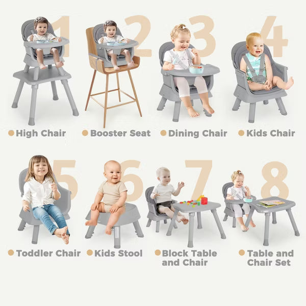 Kinder King 8 in 1 Baby High Chair, Coverts to Dining Booster Seat, Removable Tray & Double Seat Cover, Easy to Wipe