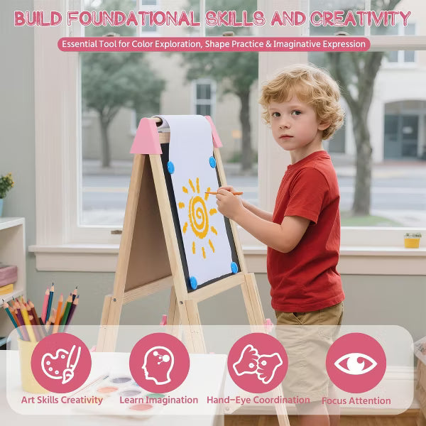 Kinder King kids easel features double-sided board, equipped with a magnetic whiteboard and magnetic chalkboard; The roll of paper is located on the top; Suitable for painting, coloring, drawing, lettering, doodling and math games, etc. Stimulate your child's imagination and interest. This unisex toddler easel is not only suitable for home, but also a good choice for kindergartens, nurseries and studio.