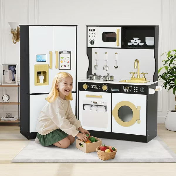 Create endless cooking adventures with this stylish black wooden play kitchen set, designed for kids ages 3 and up! Packed with realistic features like a microwave, sink, refrigerator, freezer, and a working ice maker that dispenses 2 included "ice" cubes, this kitchen inspires imaginative play. Built from durable MDF with ample storage, it’s perfect for organizing accessories and cleaning up with ease. The spacious layout lets 2–3 kids play together, making it ideal for siblings and playdates. Includes fun accessories like a grocery checklist, utensils, pots, and more—everything young chefs need to cook up fun!