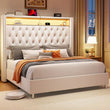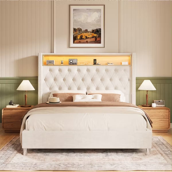 LED Bed Frame,Charging Station and Storage Upholstered Headboard,Velvet.