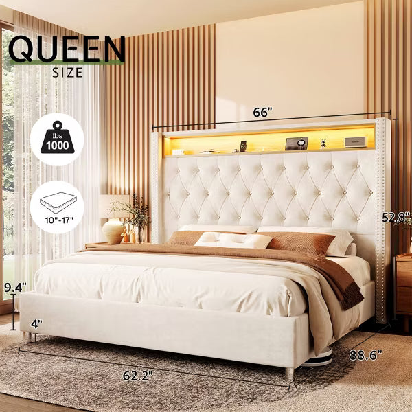 This stylish AMERLIFE LED Bed Frame brings glam style to your bedroom with its tall wingback headboard and button tufting. Whether you're updating your guest room or redoing your own bedroom, this sleek and gorgeous upholstered bed shines in any space. Specification: Queen Size Bed Frame with LED lights Headboard: 53.2" TALL Outer Dimensions: 88.2" L x 62" W x 53.2" H Packaging: Comes in 1 boxes Weight: 136.69 Pounds Loading Weight Capacity: 950 lbs Assembly Required: Yes Material: Velvet Upholstered Fabric, Solid Wood, Metal Package Content: LED Bed Frame Queen Size with Motion Nightlight, Storage Headboard with Charging Station, Wooden Slats(Mattress not included) ANY ISSUE PLEASE MESSAGE US FIRST, WE WILL REPLY WITHIN 12 HOURS AND TRY OUR BEST TO MAKE YOU SATISFY