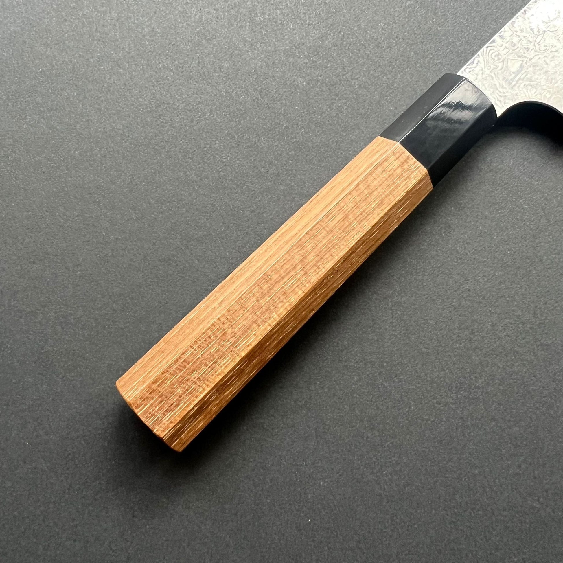 FINISH: Damascus or suminagashi. This type of finish is made by creating a Kitaeji, which is produced by repeatedly folding/stacking then compressing two different steels until they create a laminated pattern. This can then be manipulated in various ways to produce the maker’s desired pattern effect. This material is then clad around the core metal of the blade as an elaborate protective layer for the core steel - thus giving the knife a beautiful and striking appearance
