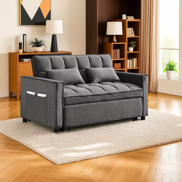 Resenkos 54 Inch Adjustable Backrest Sofa, Sofa Bed, Futon Sofa with Double Armrest and Pouch, Variable Bed for Living room, Bedroom, Gray This sofa/sofa bed features a 54-inch adjustable backrest that offers three-speed settings, allowing you to customize your seating or lying position according to your comfort needs. Equipped with double armrests, this piece of furniture not only adds a touch of elegance but also enhances your comfort while sitting. Easily switch between a cozy sofa and a comfortable bed with this innovative futon sofa. It operates as a variable bed sleeper sofa, meaning you can adjust it to different sleeping positions to suit your preferences. Main Color:Medium grey Main Material:Velvet Filler:Foam Product Style:Casual Frame Material:Wood Seat Plushness:Medium-Soft Seats:2 Seat Wood Type:Eucalyptus Wood Tone:Light Brown Upholstery Material:Velvet Product Dimensions Assembled Length (in.):54.00 Assembled Width (in.):38.00 Assembled Height (in.):31.00 Product Weight (lbs.):99.00 Package Size Length (in.):47.00 Width (in.):39.50 Height (in.):13.00 Weight (lbs.):115.00