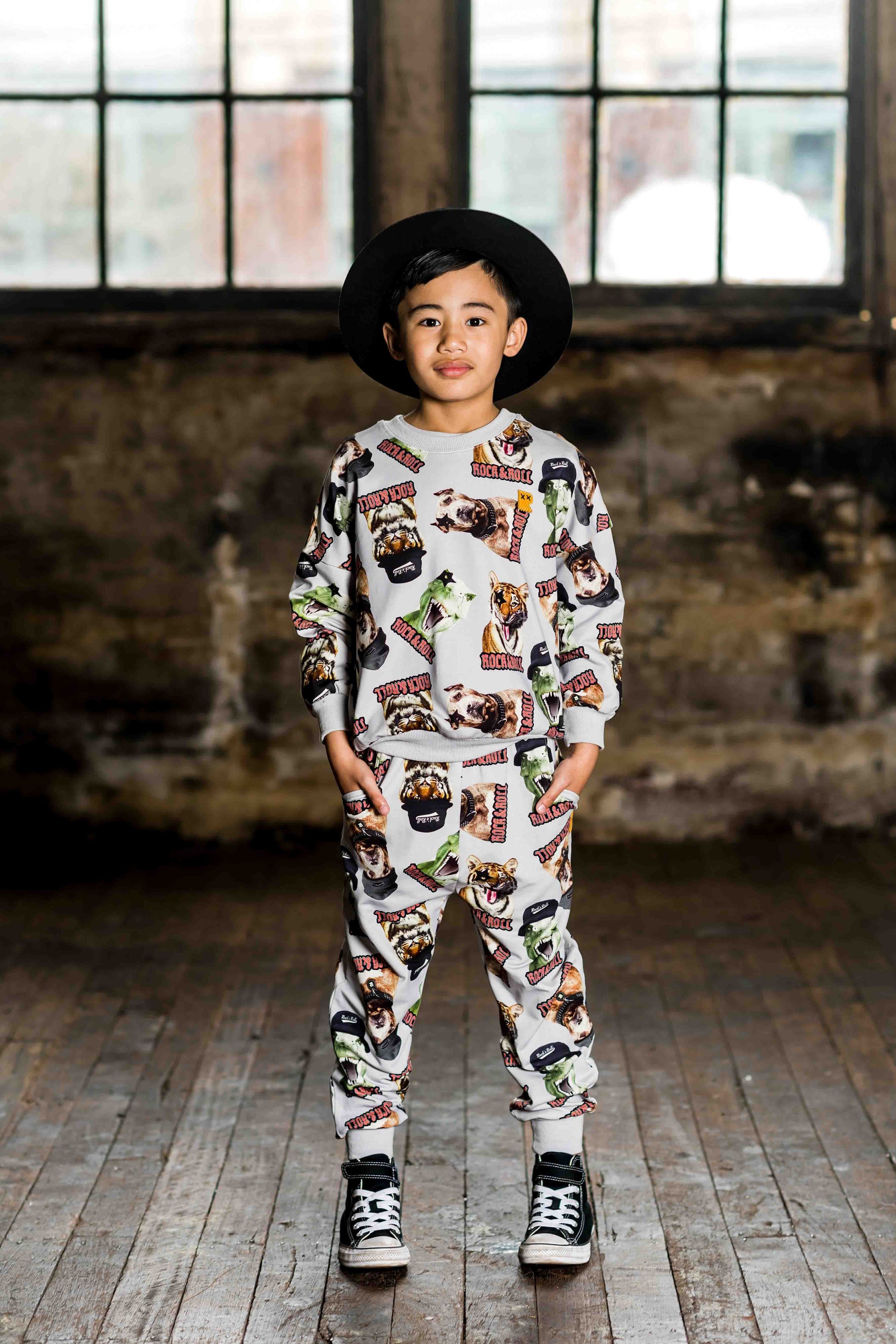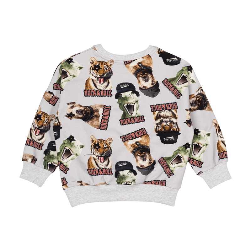 Get ready to rock in our Rock Stars Sweatshirt! Made from a soft and warm blend of cotton and elastane French Terry, this comfy grey sweatshirt features an all-over print of animals saying 'Rock and Roll'. With drop shoulders with a relaxed fit, our Rock Stars Sweatshirt will add playful flair and effortless style during the colder seasons.