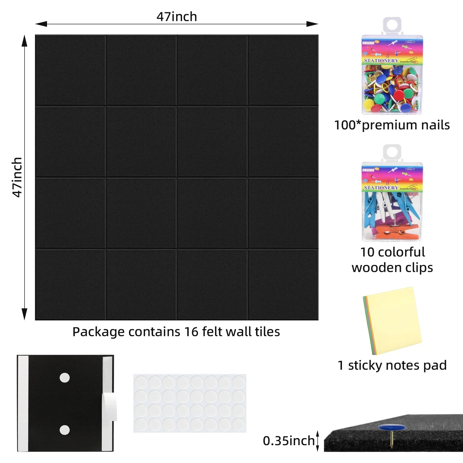 Sentryse Felt Tile Bulletin Board, 16 Pack Felt Wall Tiles with 100 Push Pins,10 Push Pin Clips, Sticky Notes, Large Alternative Cork Board for Walls Home Office, 47 X 47 inches