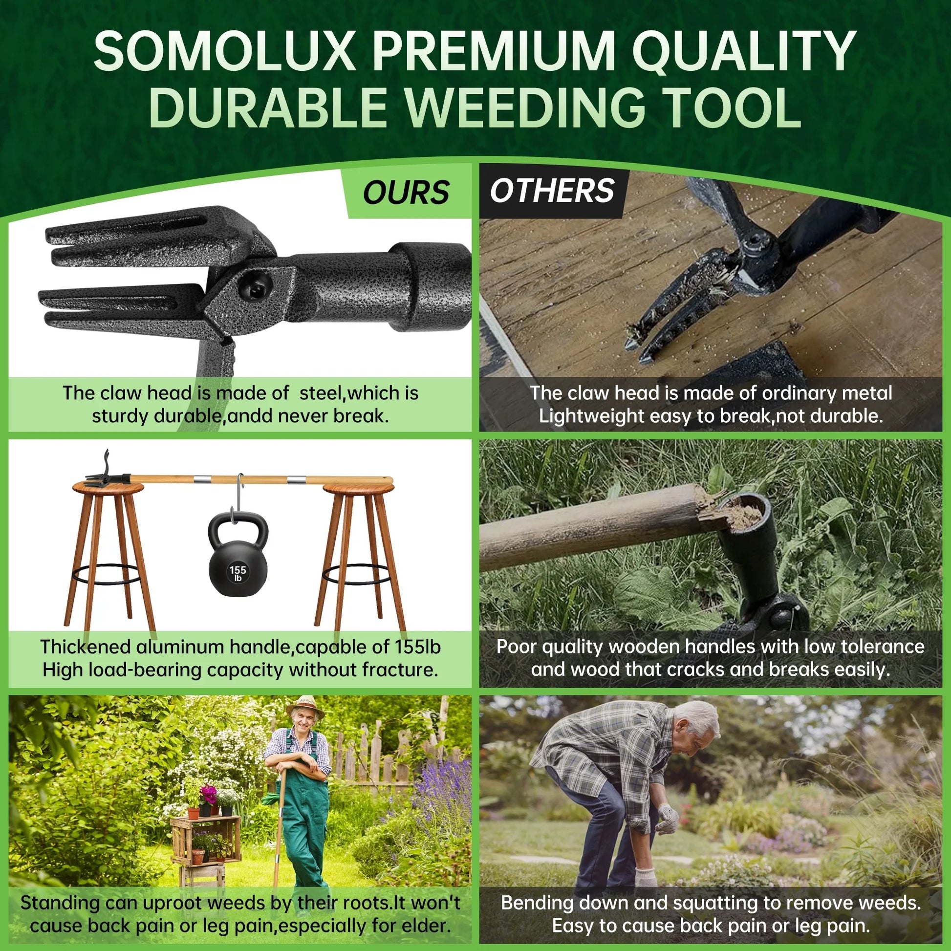 - Durable and stress-free for long-term use-the strong steel head and high-quality bamboo handle of the standing weed puller make it tough and corrosion-resistant. This weed puller will stand the test of time and will not rust, bend or twist. Ensure that this weeding tool remains efficient and durable even after a long time of use, a right-hand man for your garden weeding.