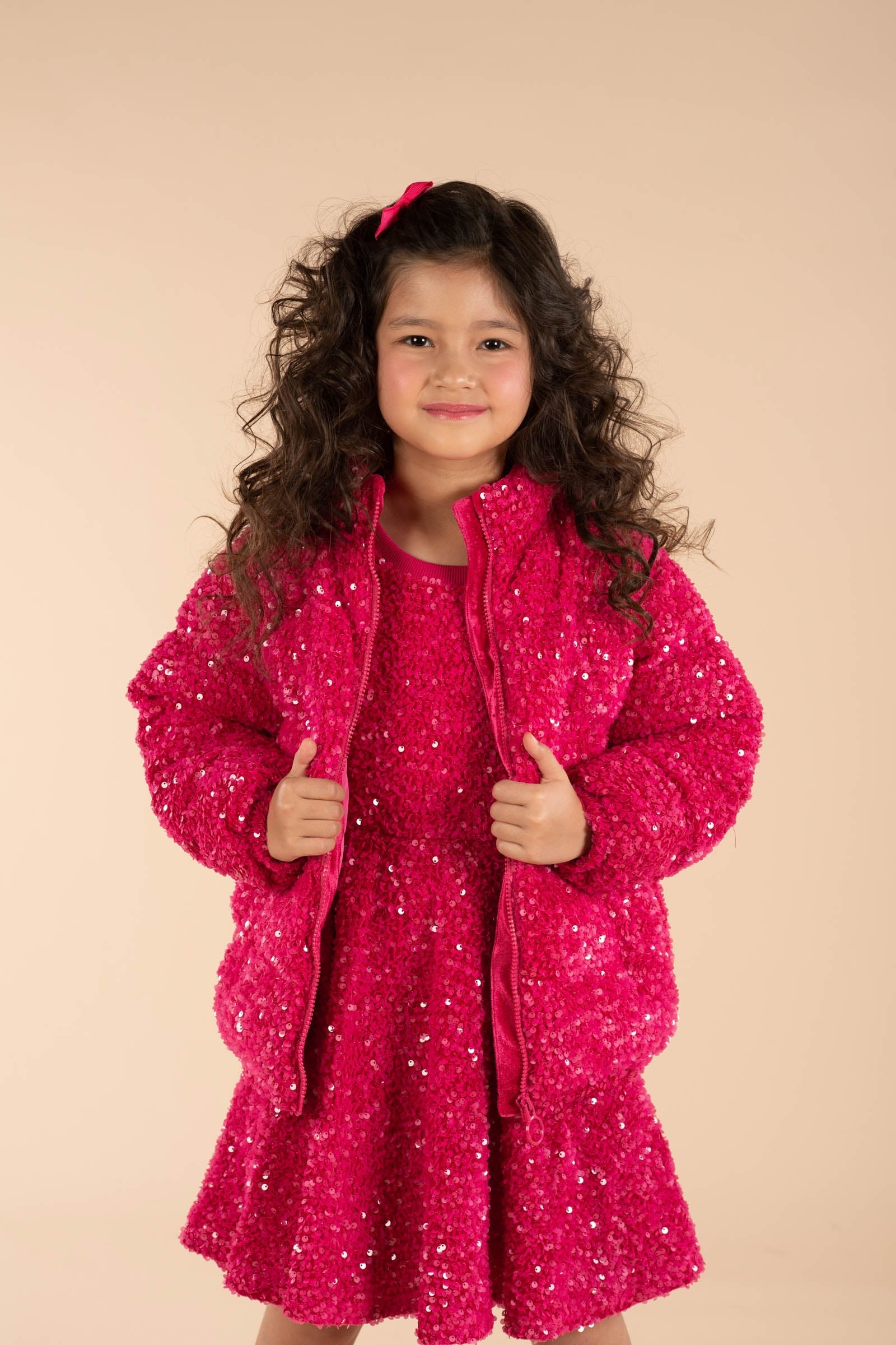 Shine bright in our Hot Pink Sequin Puffer Jacket! Made from water and wind proof treated polyester, this hot pink embellished zip-up winter jacket features an internal pink lining, with an all-over sparkly sequins! This jacket features front pockets for added convenience, and an elasticated hemline and cuffs to keep your little girl snug and cosy during the colder months. Designed with warmth and comfort in mind, our Hot Pink Sequins Puffer Jacket is sure to add a touch of shimmery charm in the colder months!