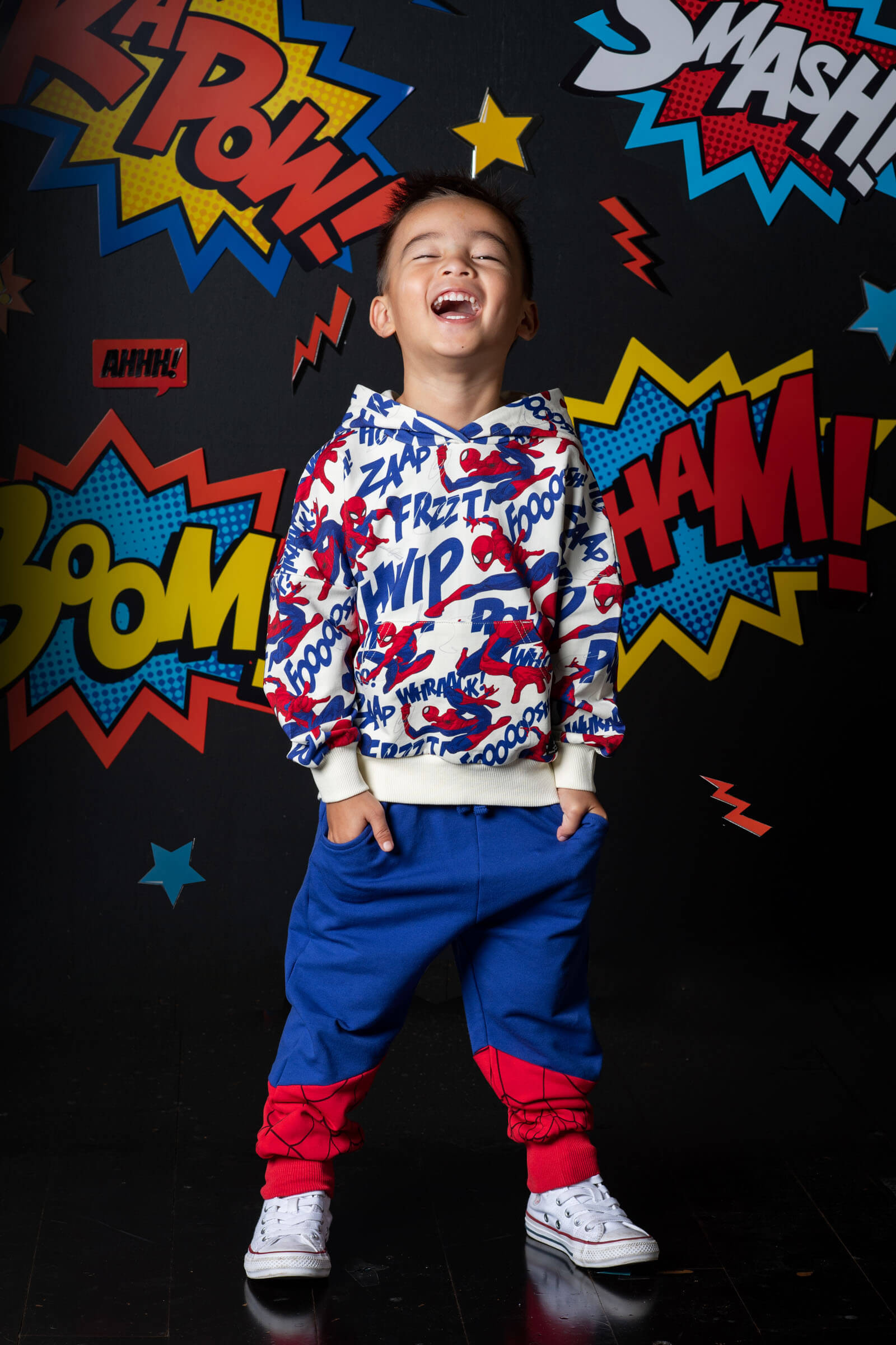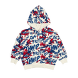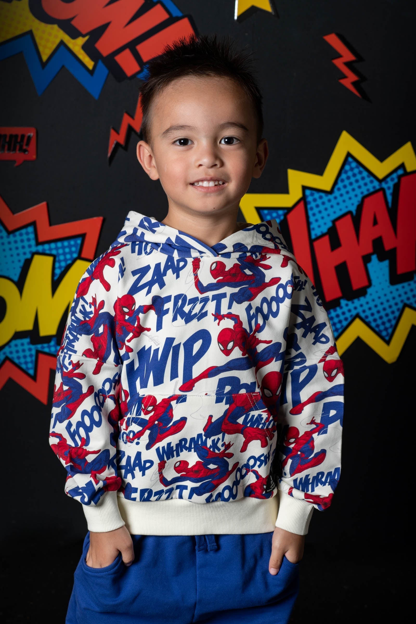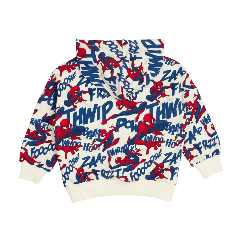 The Spider-Man Action Hoodie is part of our licensed Marvel range and is perfect for the mini action hero in your life. It features an all over Spiderman print on a cream base with an attached hood and cream rib binding at the sleeves and hem. It is made from breathable cotton elastane French Terry.