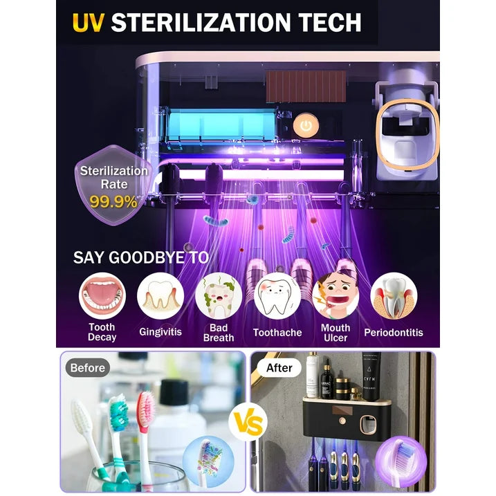 One Click to Turn on UV: Automatic timing for 5 minutes. You can determine the number of uses according to your own needs.Automatic Toothpaste Dispenser: You can control the amount of toothpaste just by controlling the force of extrusion.5 Toothbrush Holders Slots: The toothbrush holder can hold 5 toothbrushes at a time. Compatible with regular toothbrushes and electric toothbrushes. Suitable for daily use of the whole family.Organized Storage Tray: Our toothbrush holder keeps your toothbrushes, toothpaste, and other oral care essentials neatly organized, saving valuable counter space in your bathroom.Load Capacity - 33 lbs: The maximum load capacity is 33 pounds, which is suitable for storing daily necessities and can be used with confidence.Removable and Cleanable: The toothpaste dispenser adopts a detachable design, which is convenient for cleaning at any time and maintains a clean and healthy toothpaste environment.Note: Only the toothpaste dispenser part can be cleaned. Please avoid the battery part from contacting water and keep the battery part dry.
