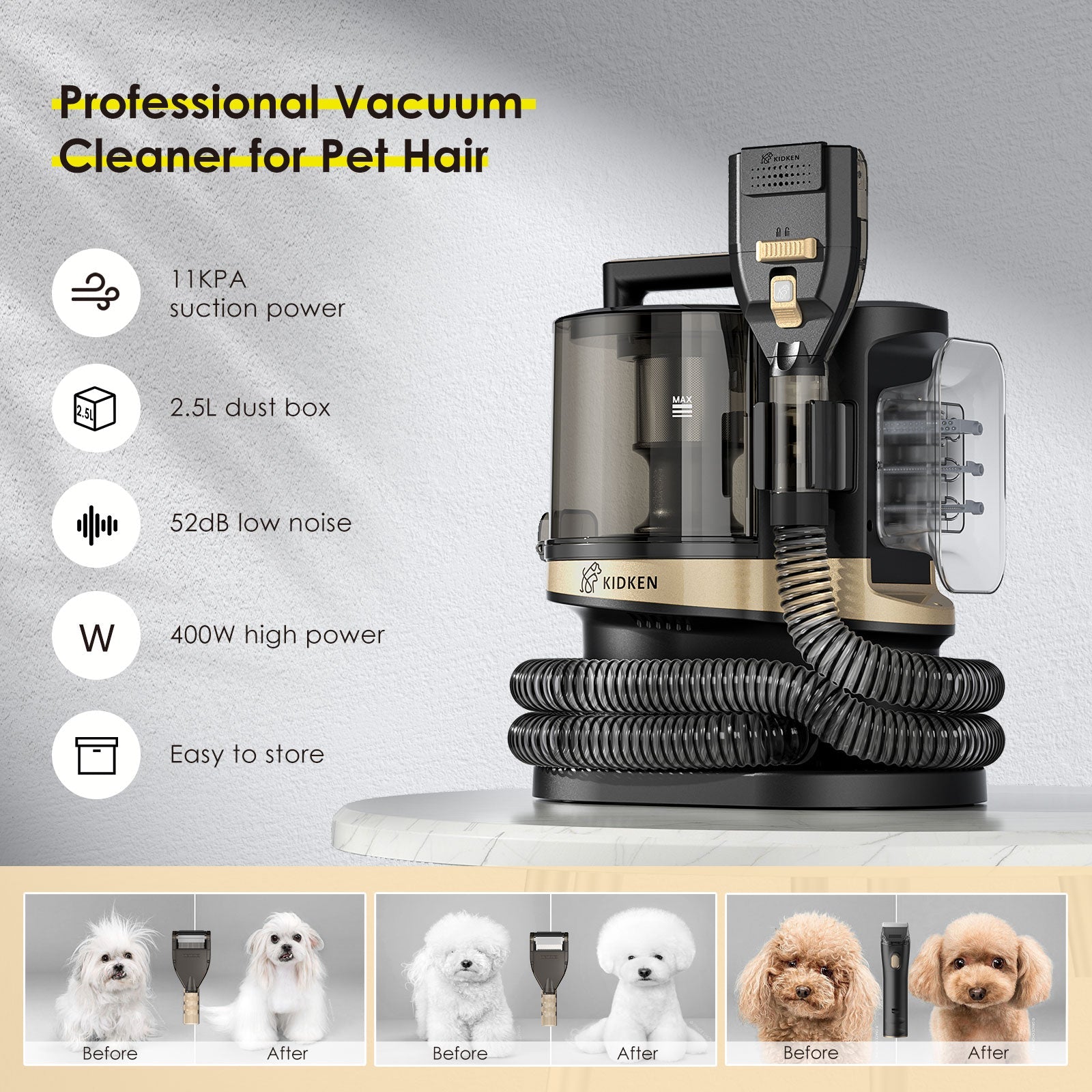 The pet grooming vacuum kit is equipped with a 3.3L upgraded dust box, Whether it's for multi-pets or large dogs, grooming can be done at one time ;The large dust box can be removed separately without too much cleaning. Gospel for lazy people.